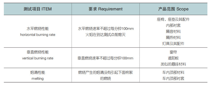 2.目前國家對汽車內(nèi)飾材料的標(biāo)準(zhǔn)只有GB8410-2006,該標(biāo)準(zhǔn)對部分內(nèi)飾材料缺乏對真實(shí)試驗(yàn)的模擬。而除了汽車,客車、校車等大型車輛對內(nèi)飾材料燃燒的條款也是引用自GB8410-2006。長途客車大量配備窗簾懸掛物,按汽車燃燒標(biāo)準(zhǔn)來對其評價(jià)是缺乏參考意義的。目前客車內(nèi)飾材料的燃燒特性標(biāo)準(zhǔn)正在起草討論中。希望此標(biāo)準(zhǔn)實(shí)施能完善目前標(biāo)準(zhǔn)的弊端。如果需要對材料進(jìn)行全真實(shí)的評價(jià)體系,除去阻燃性,還有霧化性能、車內(nèi)VOC測試,材料常規(guī)性能測試全面進(jìn)行評價(jià)。